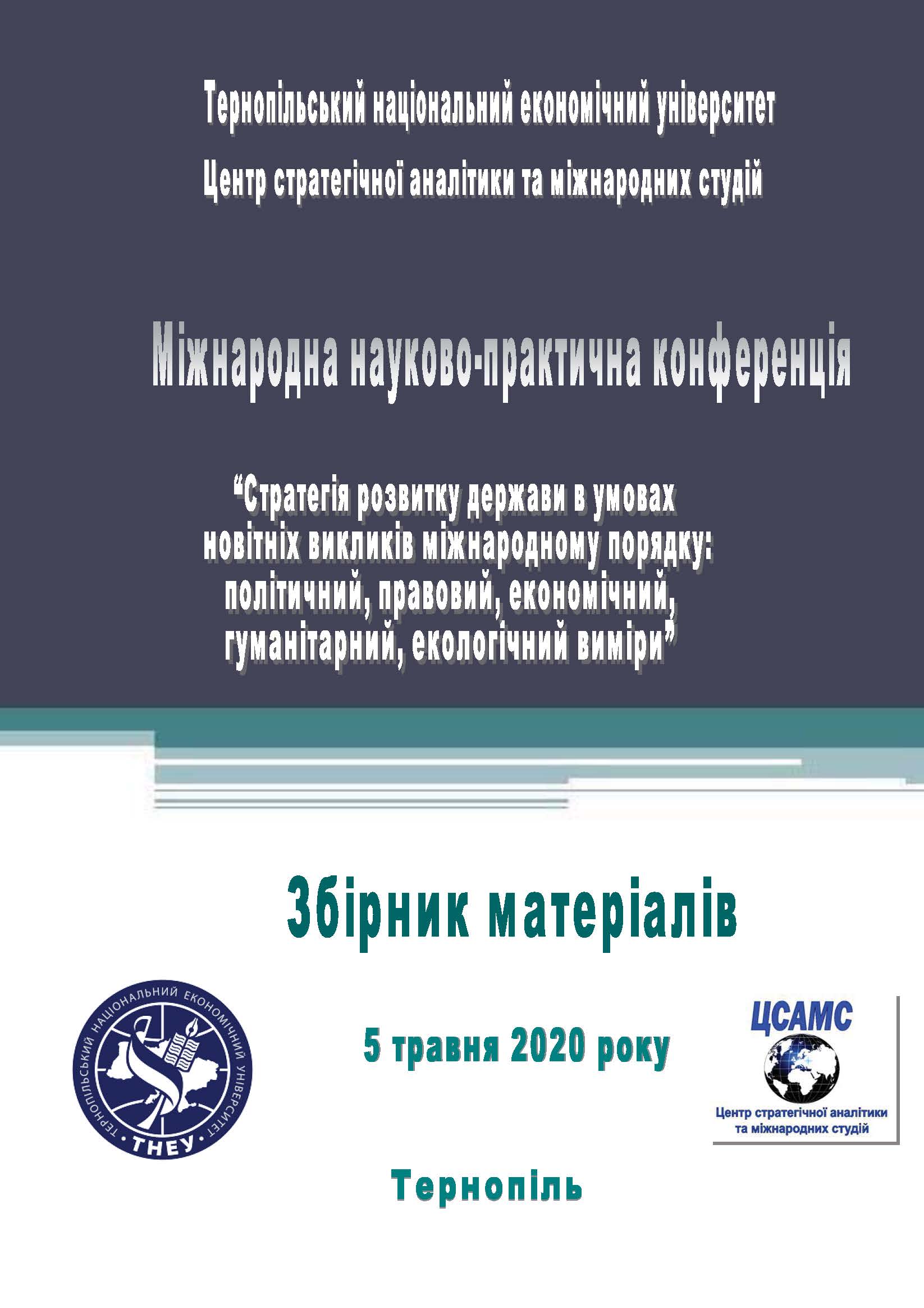 Стратегія розвитку держави в умовах новітніх викликів міжнародному порядку: політичний, правовий, економічний, гуманітарний, екологічний виміри : збірник тез доповідей Міжнародної науково-практичної конференції (5 травня 2020 року). Тернопіль : ТНПУ ім. В. Гнатюка, 2020. 160 с.